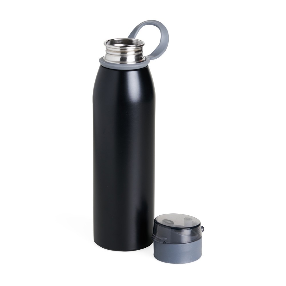 Garrafa 650ml em inox. Tampa plástica rosqueável com proteção para o bocal e alça emborrachada para transporte Especificações: - Altura  24,2 cm - Largura  6,6 cm - Circunferência  21 cm - Medidas aproximadas para gravação(CxL)  17 cm x 3 cm - Peso aproximado(g)  150