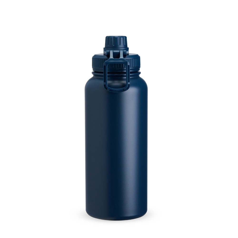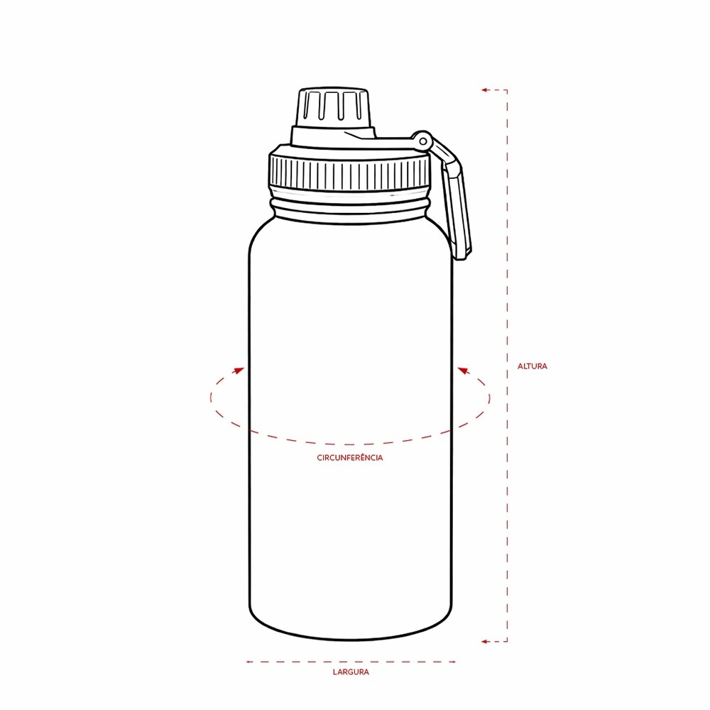 Garrafa térmica em inox com pintura eletrostática e capacidade de até 1 litro. Possui estrutura de parede dupla e isolamento a vácuo, permitindo a conservação de temperatura do líquido por mais tempo, além de evitar vazamentos. Possui tampa plástica rosqueável com proteção de coval e alça em formato retangular. Especificações: - Altura  25,5 cm - Largura  9 cm - Circunferência  28,5 cm - Medidas aproximadas para gravação(CxL)  15 cm x 9 cm - Tamanho total aproximado(CxL)  Diâmetro bocal 5,5 cm - Peso aproximado(g)  425