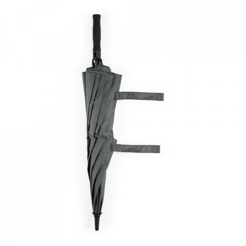 Guarda-chuva em 100% poliéster reciclado 190T (100% rPET) com abertura automática Guarda-chuva em poliéster 100% reciclado 190T, com varetas em fibra de vidro e pega em ABS reciclado. Guarda-chuva com abertura automática e à prova de vento. Fornecido em bolsa de poliéster reciclado. ø1055 x 840 mm