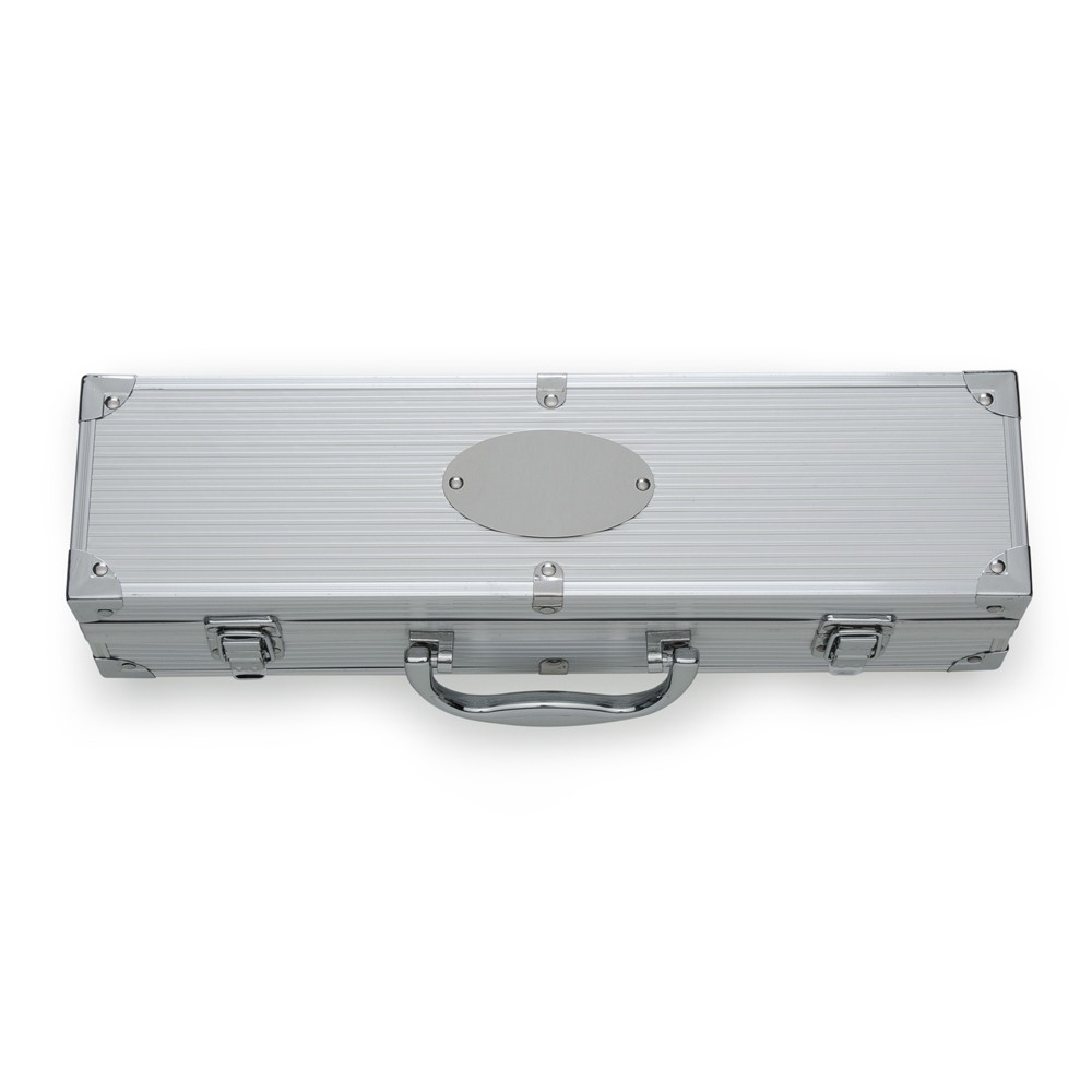 Kit de churrasco com três peças em aço inox, incluindo: um pegador, um garfo e uma faca de corte com lâmina de 6 polegadas. Além disso, os utensílios são acomodados em maleta de alumínio com revestimento interno em TNT e plaquinha para personalização.