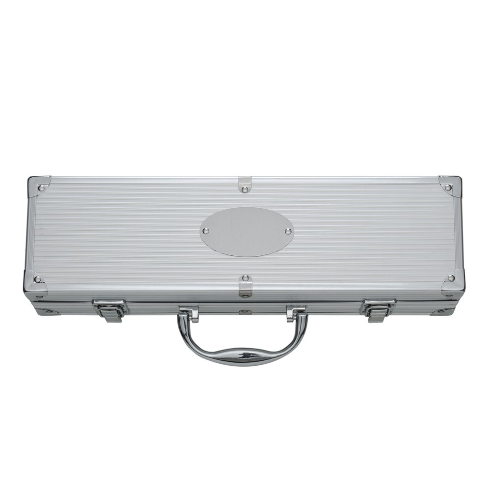 Kit churrasco 4 peças em maleta de alumínio com travas de segurança, contém: espátula, pegador, garfo e faca em inox. Parte interna da maleta com revestimento em tnt e suportes de velcro para fixação das peças.