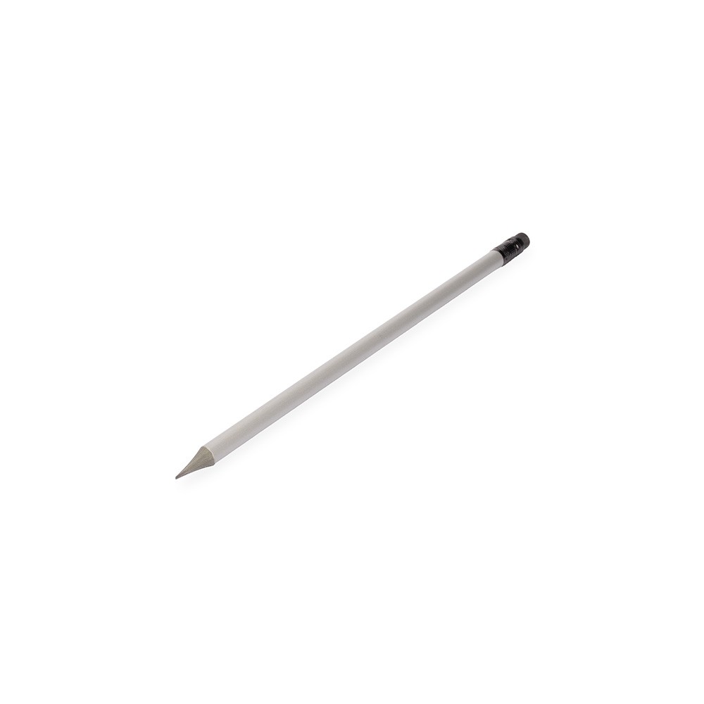 Lápis de corpo redondo em madeira com grafite preto HB e uma borracha na ponta.