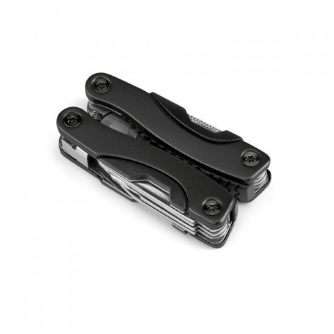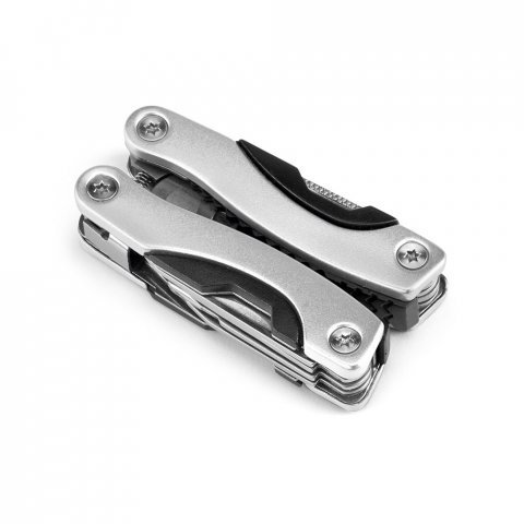 Mini alicate multifunções dobrável em aço inox e alumínio. Incluso 9 funções: alicate, lâmina de serra, 2 abridores, parafuso com a cabeça cruzada, faca, chave de fendas de cabeça plana (grande e pequena) e lima de unhas. Fornecido em bolsa de 600D. Fechado: 35 x 70 x 18 mm | Bolsa: 50 x 90 x 20 mm