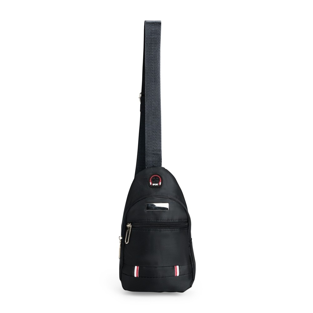 Mini bolsa confeccionada em tecido Oxford resistente à água e alça transversal ajustável em nylon 1L. Possui dois compartimentos e um bolso interno, todos com fechamento em zíper, além de entrada para fones de ouvido e uma pequena placa metálica para personalização.