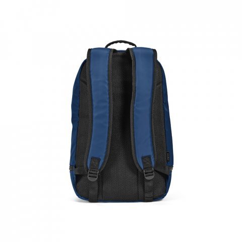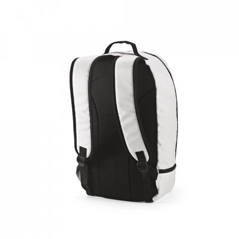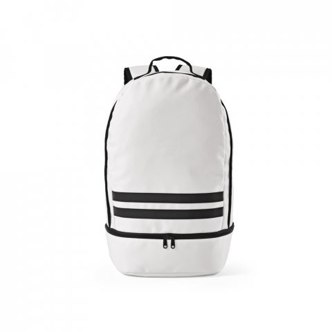 Mochila em poliéster reciclado 290T e sarja com compartimento para sapatos 25 L Mochila em poliéster reciclado 290T e sarja com forro em poliéster reciclado 210D. Possui um compartimento principal e um compartimento inferior ideal para guardar sapatos. Mochila totalmente forrada com costas e alças almofadadas. Contém duas faixas pretas refletoras na parte da frente. Capacidade até 25 L. 300 x 480 x 210 mm