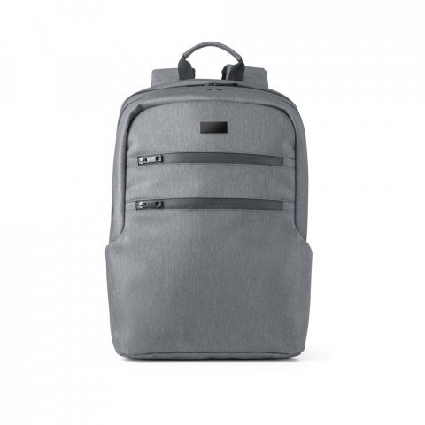 Mochila para notebook 17" em Nylon 2Tone impermeável 14 L Mochila para notebook em Nylon 2Tone impermeável com 2 compartimentos e alças almofadadas. Possui um compartimento posterior com 2 divisórias almofadadas com fecho em velcro para notebook até 17'' e tablet até 10.5'', um compartimento frontal com diversos bolsos interiores, dois bolsos na parte frontal, tendo um deles bloqueio RFID. Nas laterais existe um bolso para squeezes em elastano e outro para o guarda-chuva, com ilhós perfurados para evitar acumulação de água. A parte posterior almofadada tem bolso oculto e banda para transporte em trolley. Placa metálica removível com imã para fácil gravação. Capacidade até 14 L. 320 x 450 x 140 mm