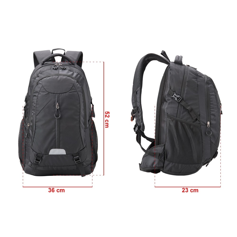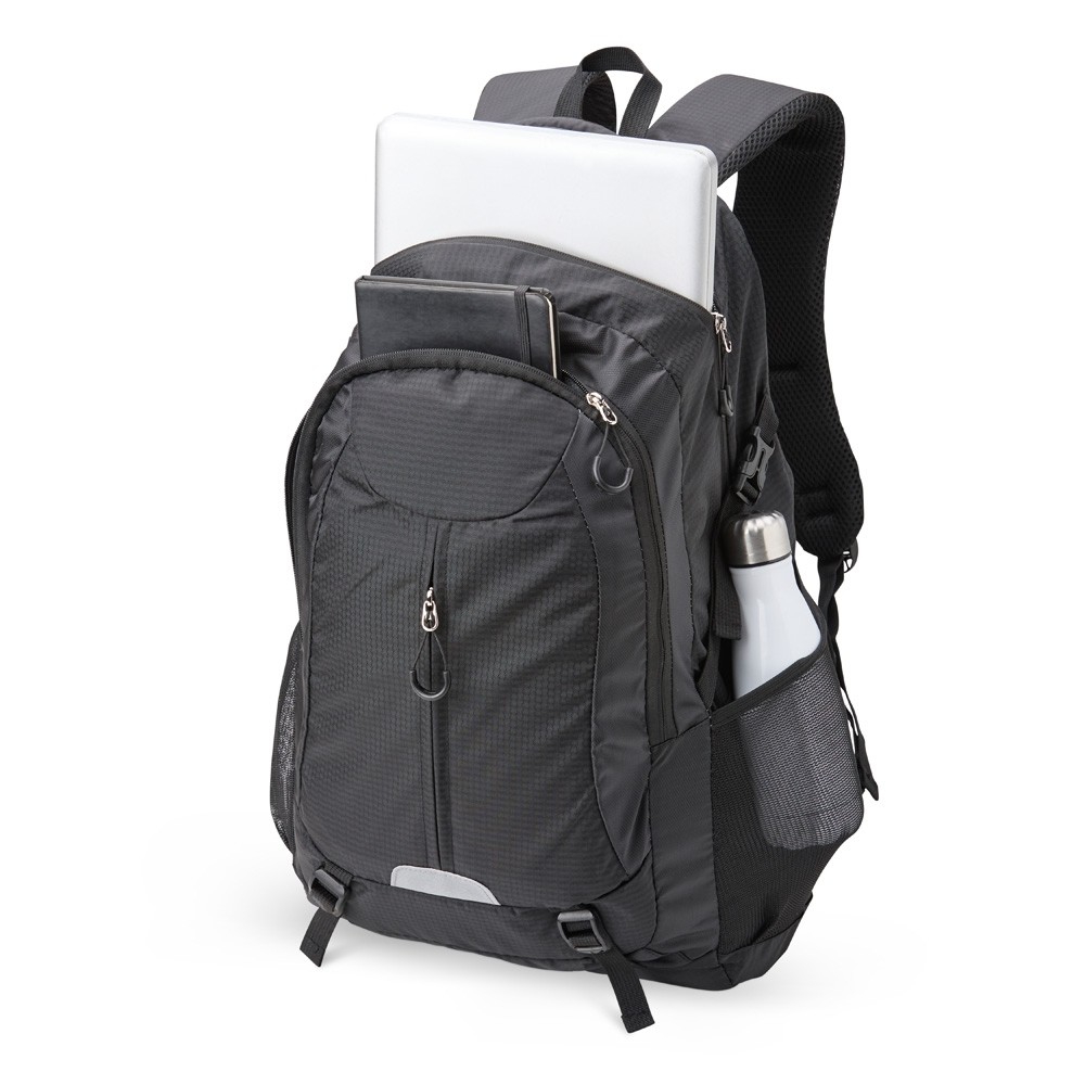 Leve tudo e mais um pouco com a nossa mochila de poliéster de 40 litros. Espaçosa e eficiente, possui três compartimentos, sendo o principal com um bolso para notebook de até 15,6 polegadas. Conta com divisórias internas para manter acessórios organizados e bolsos laterais de tela para acesso fácil aos itens essenciais. Esse modelo possui revestimento espumado nas costas para maior conforto e, para sua segurança, tem um detalhe refletivo na parte frontal, aumentando sua visibilidade em condições de pouca luz. Além disso, há um apito integrado em uma das fivelas, e as alças de compressão e compensação ajudam a distribuir o peso de forma equilibrada.