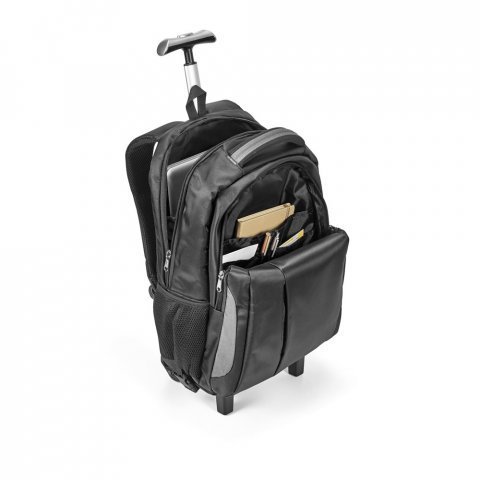 Mochila trolley para notebook 17'' em Nylon 999 impermeável com 2 rodas e sistema de proteção integrado 30 L Mochila trolley para notebook em Nylon 999 impermeável com 2 rodas com sistema de proteção integrado. Possui um compartimento principal almofadado para notebook até 17’’, um compartimento forrado e diversos bolsos. Bolso frontal com zíper e bolsos laterais em tela mesh. Trolley com pega extensível em alumínio com mola (altura da pega estendida até 550 mm), sendo a estrutura removível. Placa metálica removível com imã para fácil gravação. Capacidade até 30 L e peso de 1,70 kg. 350 x 460 x 225 mm | Placa: 50 x 20 mm