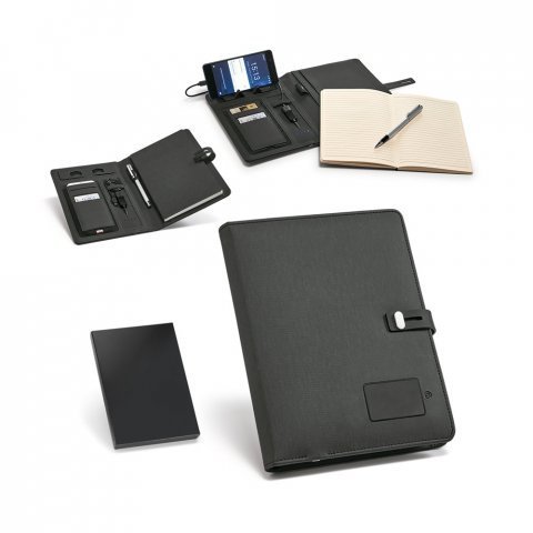 Pasta A5 em c. sintético com bateria portátil embutida (lítio). A bateria tem capacidade para 4.000 mAh, tempo de vida ≥ 500 ciclos com entrada/saída 5V/1A e cabo USB-C para carregar a bateria. No interior, contém um caderno removível com 128 páginas pautadas de cor marfim, um suporte para esferográfica (não inclusa), elásticos para organização e suporte para smartphone. No exterior, uma placa com acabamento emborrachado, LED interior e botão on/off. Fornecida em caixa presente. 165 x 225 x 25 mm | Placa: 55 x 35 mm | Caixa: 180 x 240 x 35 mm
