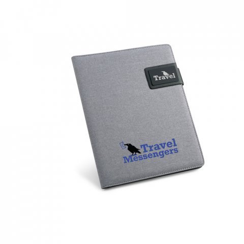 Pasta A5 em linho sintético e c. sintético com fecho magnético. O interior contém um bloco de 40 páginas pautadas, suporte para esferográfica (não inclusa) e outros compartimentos para acessórios (não inclusos). 183 x 252 x 18 mm | Placa: 50 x 30 mm