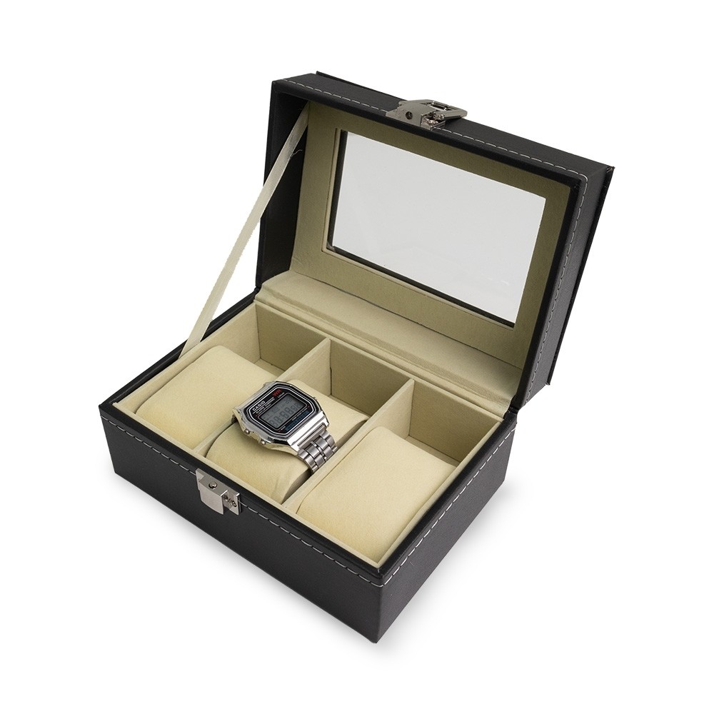 Porta relógios em couro sintético com revestimento aveludado. Possui três divisórias com almofadas para relógios, visor em acrílico e fechadura com trava.