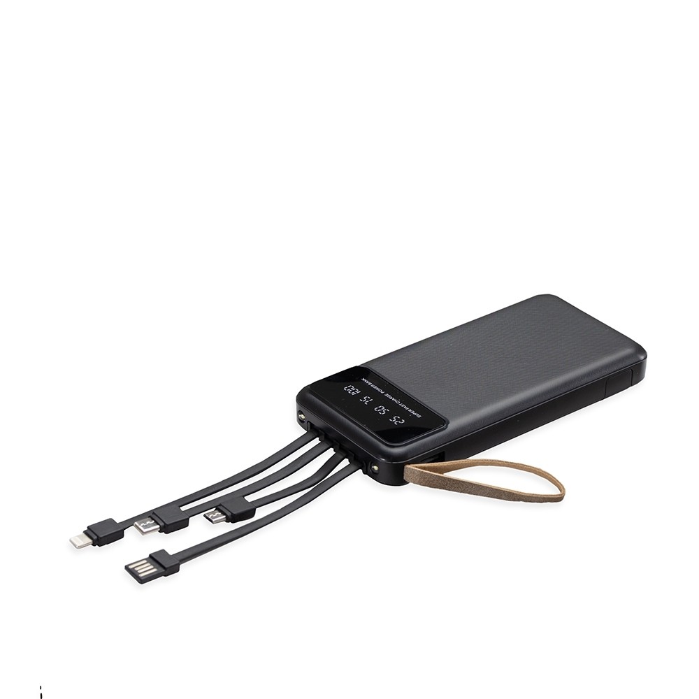 Carregador power bank de 10.000mAh com lanternas, múltiplas saídas e suporte para celular. Fabricado em plástico com display integrado, este power bank vem equipado com quatro cabos de carregamento, eliminando a necessidade de transportar cabos extras. Compatível com entradas V8, Tipo-C, Lightning e USB, praticidade é o sinônimo deste carregador. Com alça de couro sintético e um suporte funcional para celular, estilo gaveta, o power bank possui capacidade real de 6.000mAh para manter os dispositivos sempre carregados. Acompanha cabo USB-V8.