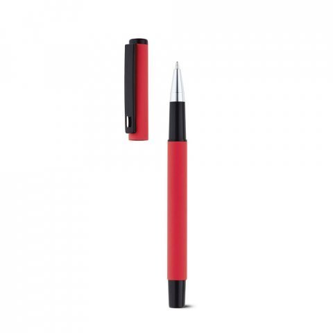 Roller em alumínio com clipe de metal e acabamento emborrachado. Escrita em preto. ø10 x 136 mm