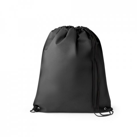 Sacola tipo mochila em non-woven (80 g/m²) termo-selado Sacola tipo mochila em non-woven (80 g/m²) termo-selado com ilhós de metal e cordão 4/1 preto. Fabricado no Brasil. 330 x 400 mm