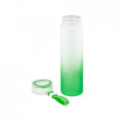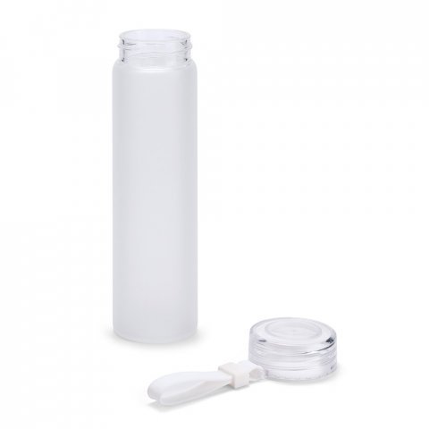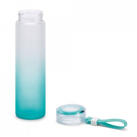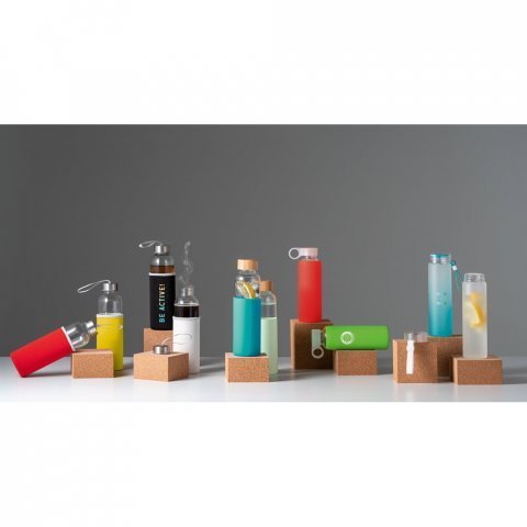 Squeeze em vidro borossilicato e tampa em AS com alça 470mL Squeeze em vidro borossilicato e tampa em AS, com alça em silicone para fácil transporte. Capacidade até 470 mL. Fornecido em caixa presente. Certificação EU Food Grade. ø60 x 210 mm