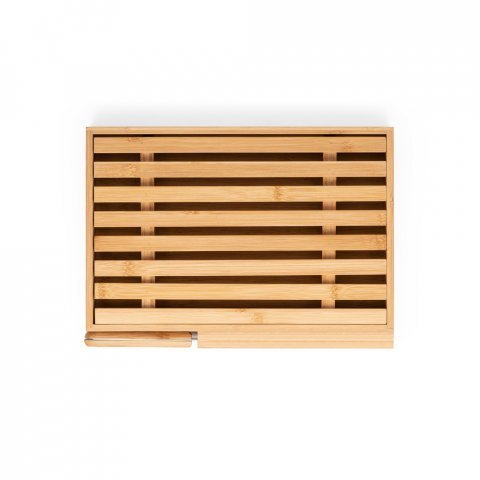 Tábua para pão em bambu com faca em aço inox. Grelha removível para fácil limpeza de migalhas. Fornecido em caixa presente de papel kraft reciclado. Certificação EU Food Grade. A cor e o resultado da impressão nos materiais naturais pode variar entre produtos. 350 x 250 x 40 mm