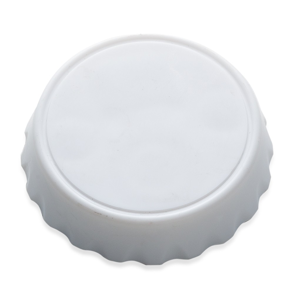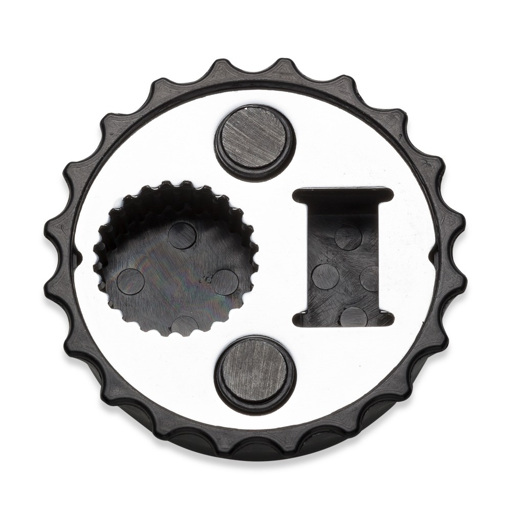 Abridor formato tampa de garrafa com imã para geladeira, contém dois tipos de abridores de garrafa. Especificações: - Altura  7,7 cm - Largura  7,7 cm - Medidas aproximadas para gravação(CxL)  6,6 cm x 6,6 cm - Peso aproximado(g)  50