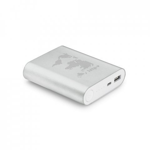 Bateria portátil em alumínio e bateria de lítio com capacidade de 8.000 mAh Bateria portátil em alumínio. Bateria de lítio com capacidade de 8.000 mAh, tempo de vida ≥ 500 ciclos e com porta de saída USB-A. Incluso cabo USB-C para carregar a bateria. Fornecida em caixa presente de papel kraft reciclado. 90 x 77 x 22 mm | Caixa: 110 x 85 x 25 mm