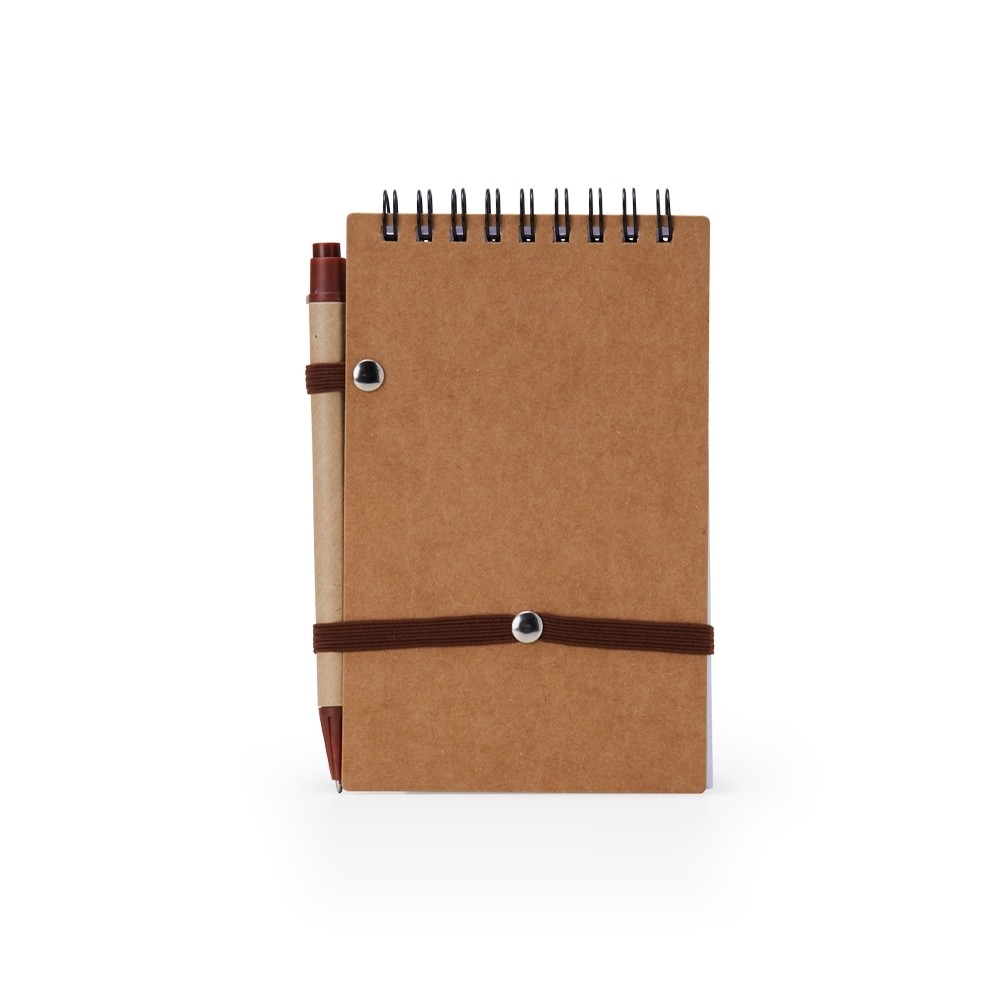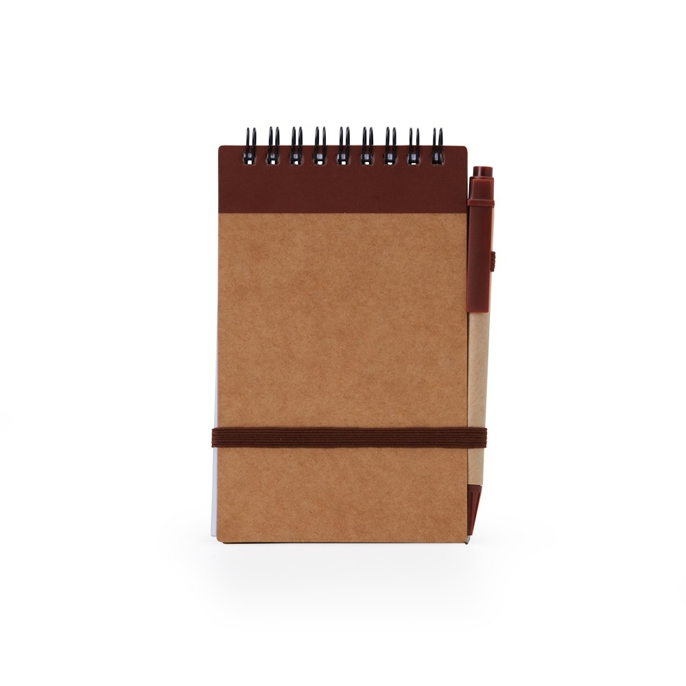 Bloco de anotações ecológico com caneta, feito em kraft com detalhe plástico. Contém aproximadamente 70 folhas brancas com pauta, porta caneta elástico, elástico para lacre e acompanha caneta de papelão com detalhes plásticos, carga esferográfica azul 1.0mm e acionamento por clique.