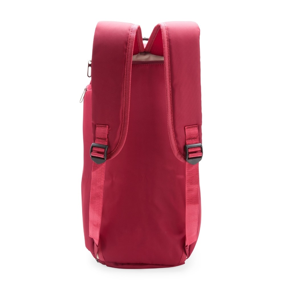 Bolsa esportiva com capacidade de até 28 litros em poliéster resistente à água com cinco compartimentos, incluindo espaço exclusivos para tênis, itens molhados e para o armazenamento da alça de costas, o que permite utilizá-la como mochila. Possui ainda alça transversal removível, alças de mãos com suporte de juntura.