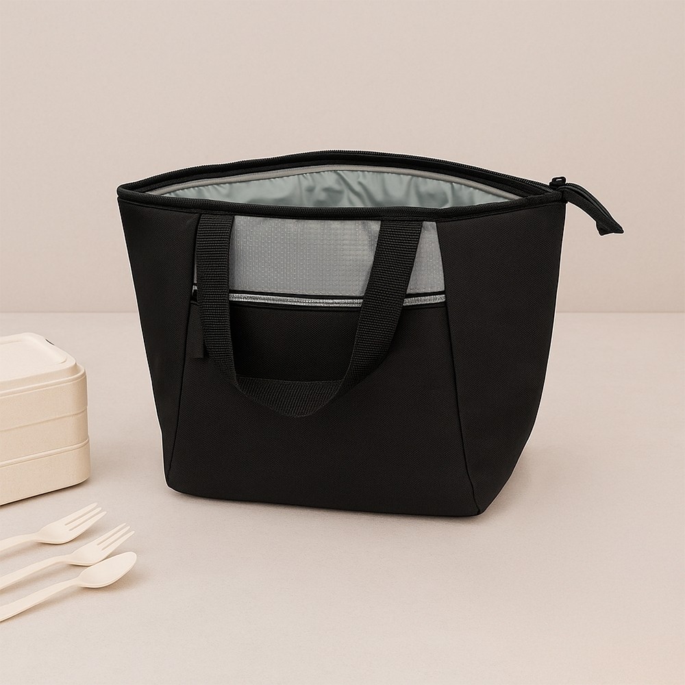 Bolsa térmica de poliéster 600D com capacidade de 9 litros com bolso frontal e alças de mãos.
