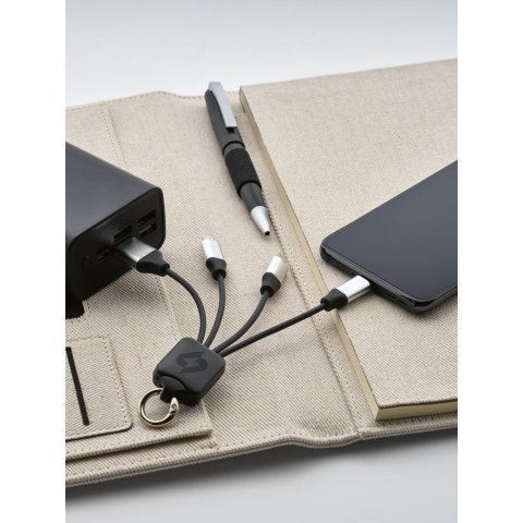 Cabo USB de carregamento rápido 3 em 1 com corpo em PET 100% reciclado Cabo USB de carregamento rápido 4 em 1 com corpo em PET 100% reciclado. Contém uma porta de USB-A de entrada e uma USB-C, uma micro-USB e uma lightning de saída. Adequado para carregar dispositivos móveis. Fornecido em caixa presente de papel kraft reciclado. 100 x 40 mm | Caixa: 70 x 19 x 165 mm