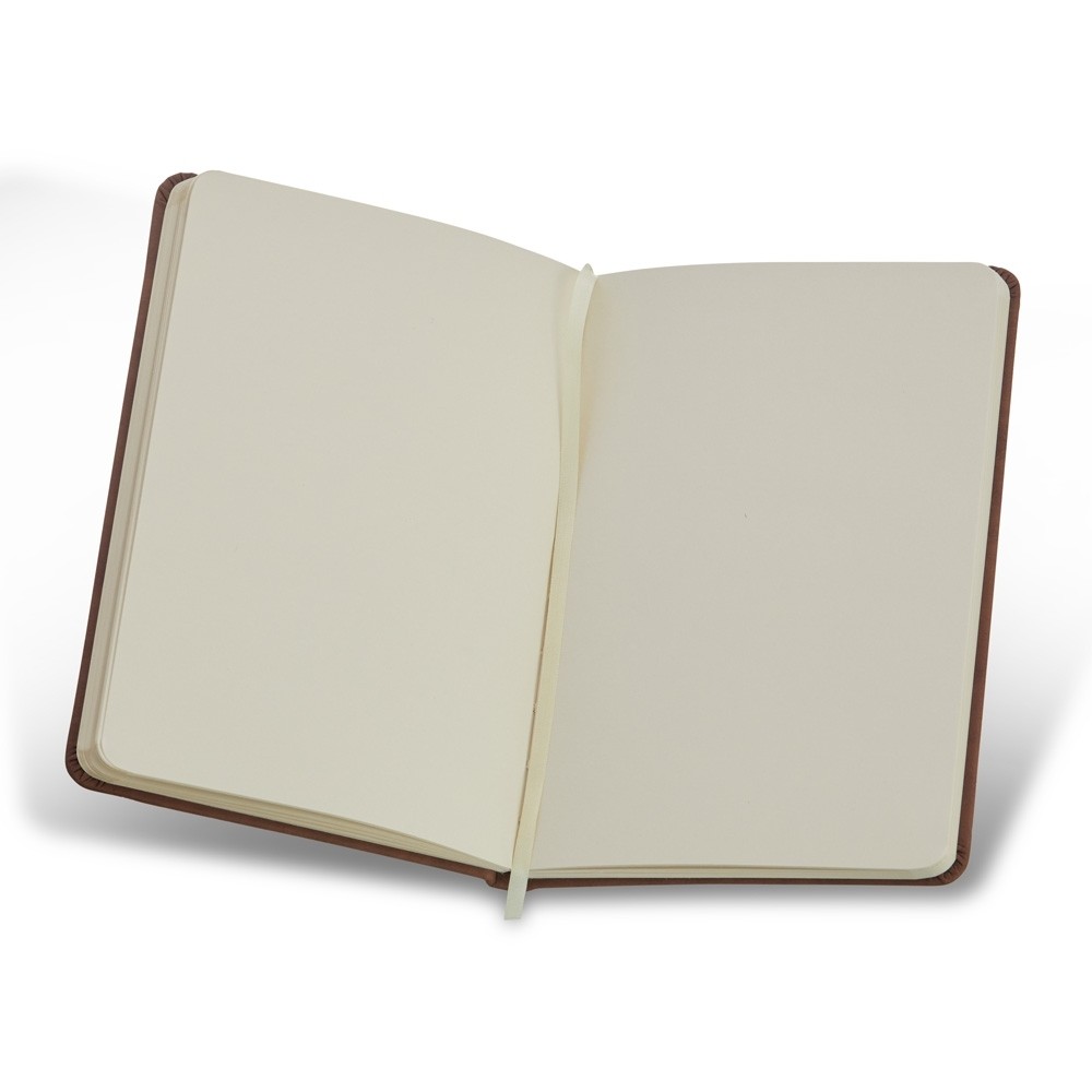 Caderneta em couro sintético emborrachado, possui marca página em cetim e elástico para lacre. Contém aproximadamente 80 folhas marfim sem pauta.