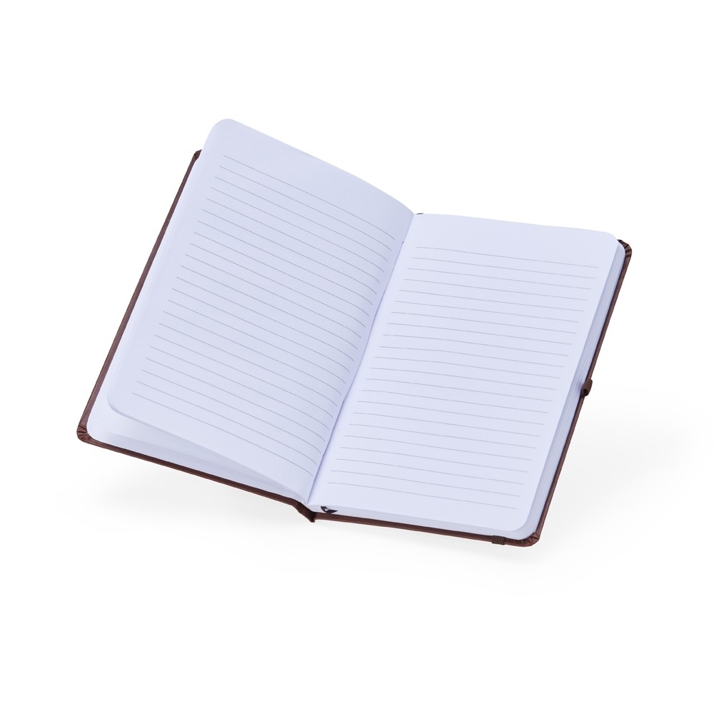 Caderneta de couro sintético com suporte para caneta, elástico para lacre e marcador de página em cetim, contém aproximadamente 80 folhas com pauta na cor branca.