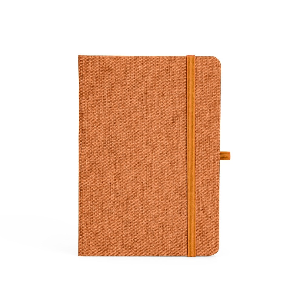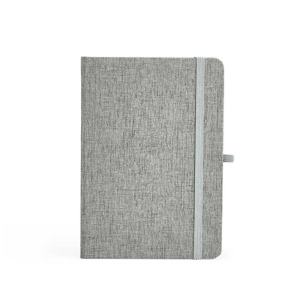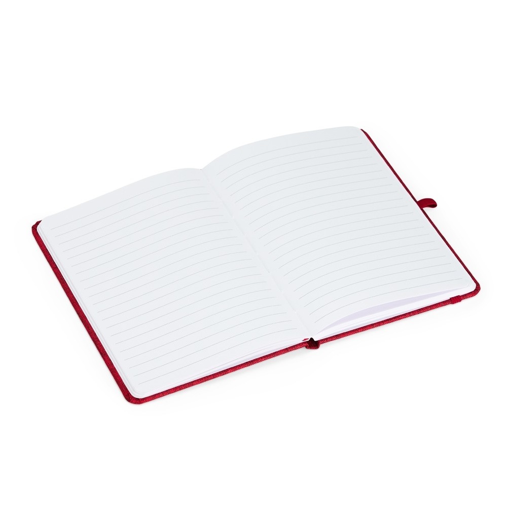 Caderneta feita de linho com porta caneta elástico, marcador de página em cetim e fita elástica para fechar. Contém aproximadamente 80 folhas brancas pautadas. Especificações: - Altura  17,5 cm - Largura  12,4 cm - Espessura  1,3 cm - Medidas aproximadas para gravação(CxL)  13 cm x 8 cm - Peso aproximado(g)  174