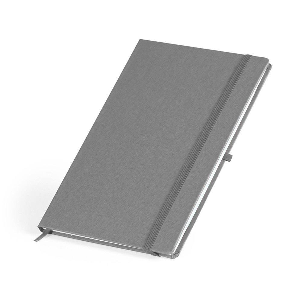Caderneta em percalux com marcador de página em cetim e fita elástica para fechar. Contém aproximadamente 80 folhas sem pauta.