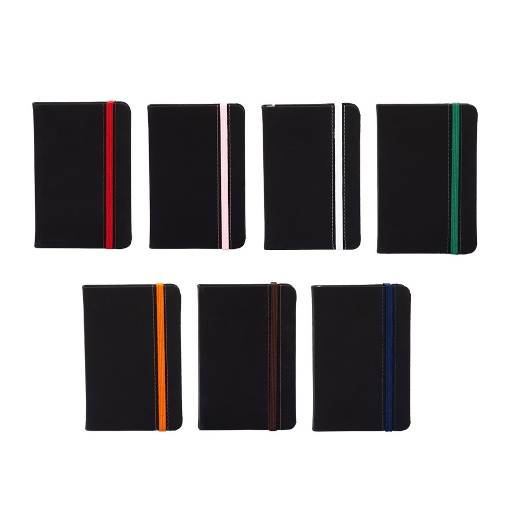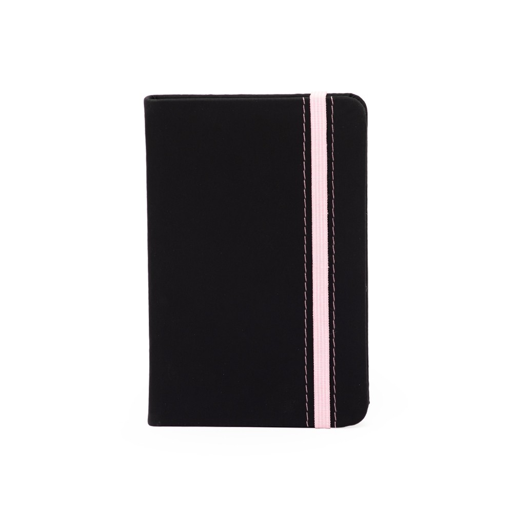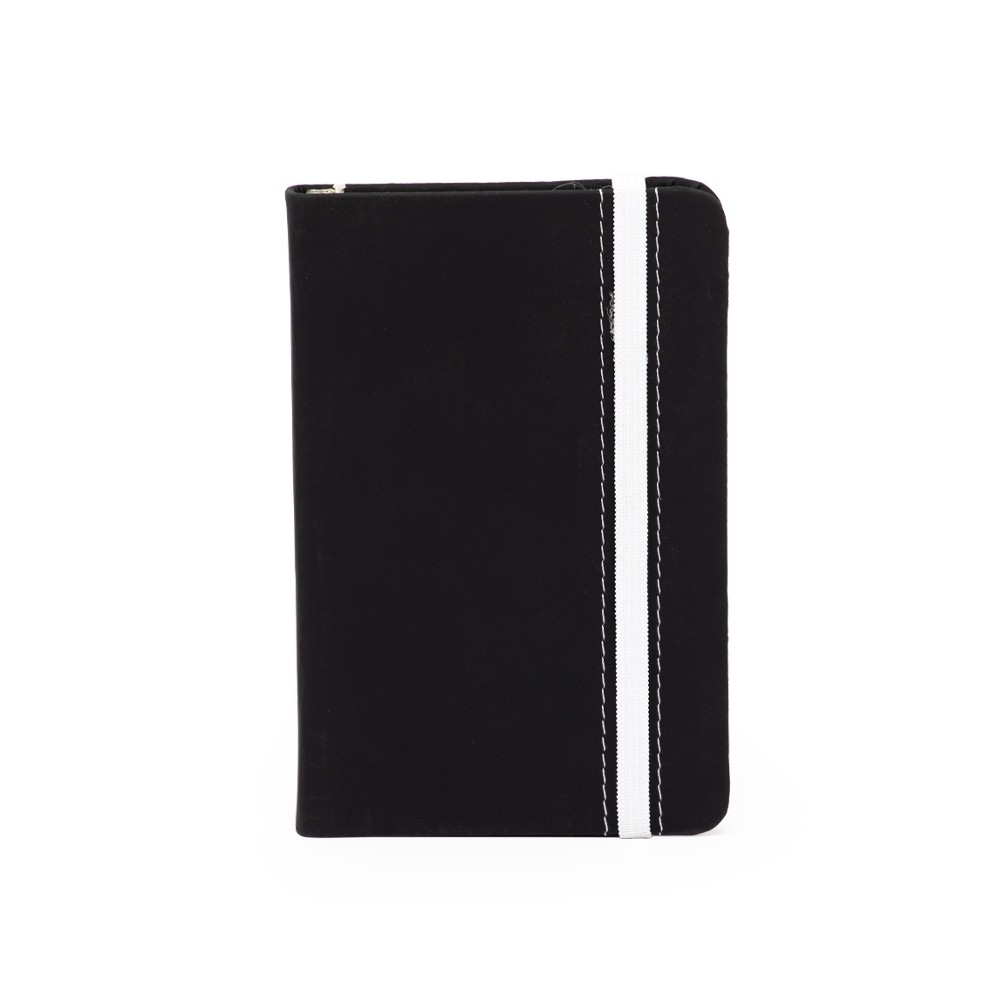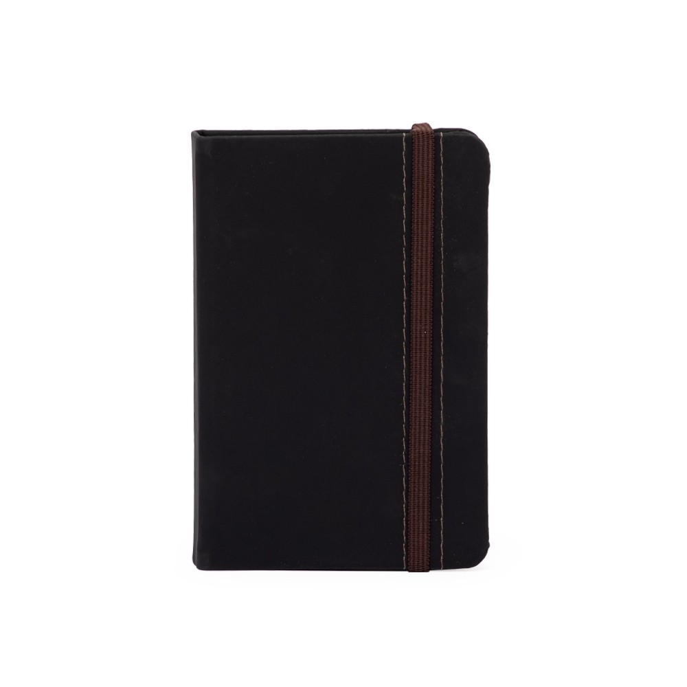 Caderneta emborrachada com marcador de página em cetim e fita elástica de nylon para fechar. Contém aproximadamente 78 folhas marfim pautadas.