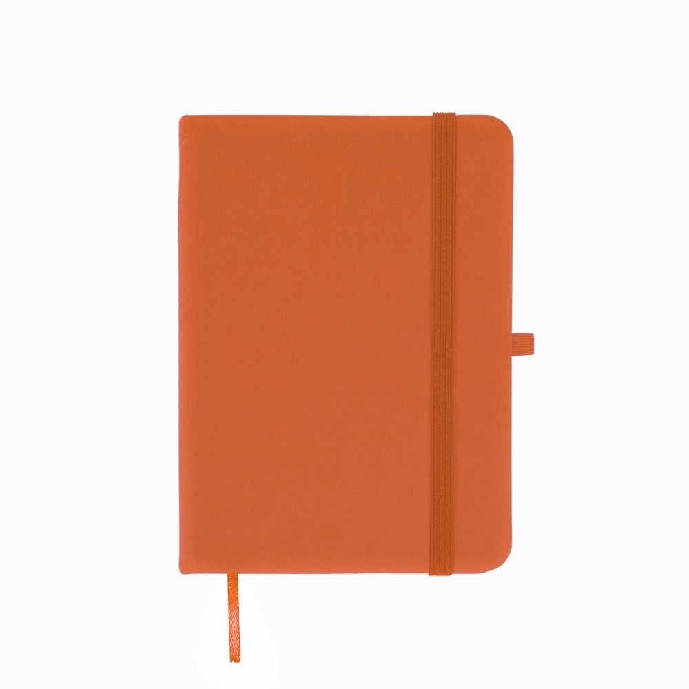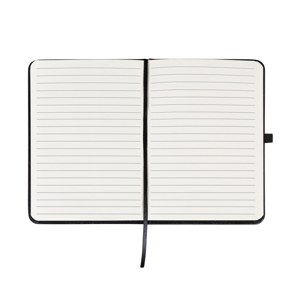 Caderneta emborrachada com elástico para lacre, marcador de página em cetim e porta caneta, contém aproximadamente 84 folhas marfim com pauta.