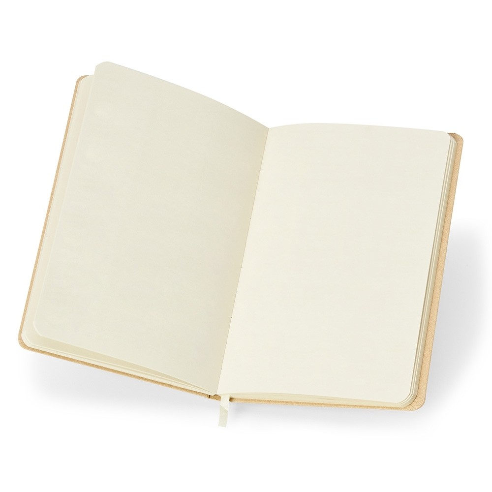Caderneta de kraft com marca página em cetim e elástico para lacre. Contém aproximadamente 80 folhas marfim sem pauta.
