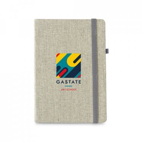 Caderno A5 de capa dura em canvas (poliéster). Contém 192 páginas lisas em cor marfim, fita separadora, elástico e suporte para esferográfica (não inclusa). Fornecido em bolsa de non-woven. 148 x 210 mm | Bolsa: 185 x 240 mm