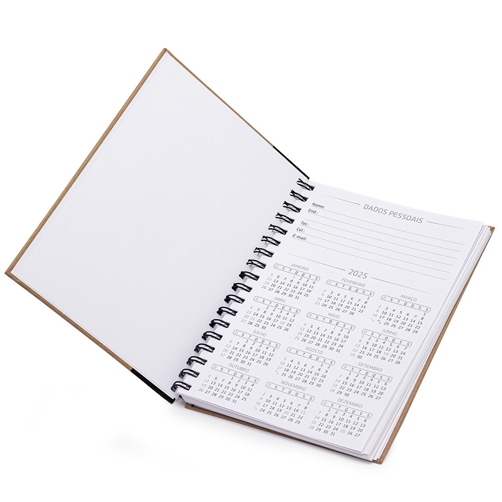 Caderno com capa kraft e espiral metálico. Possui aproximadamente 85 folhas brancas pautadas e folhas destinadas aos dados pessoais, calendário de 2024 à 2026, planejamento e contatos. Especificações: - Altura  23,7 cm - Largura  17,9 cm - Espessura  2 cm - Medidas aproximadas para gravação(CxL)  21 cm x 14 cm - Peso aproximado(g)  420