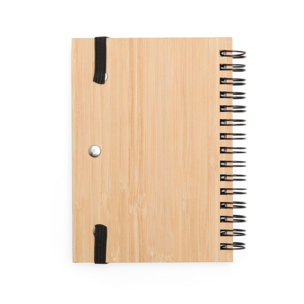 Caderno com capa dura feita em bambu, encadernação Wire-O, porta-canetas e fechamento em elástico. Contém aproximadamente 50 folhas brancas com pauta. Acompanha caneta esferográfica com carga azul de 1,0 mm, corpo em bambu, acionamento por clique, além de clip e ponta em metal.