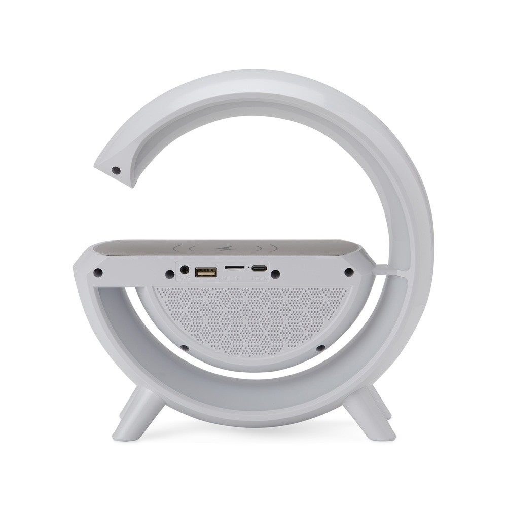 Caixa de som multimídia com estrutura em plástico, iluminação em LED ajustável e espaço para carregamento de dispositivos por indução. Possui conectividade Bluetooth 5.2 e rádio FM, além de entradas auxiliar P2, USB-C, USB-A e TF, possibilitando a reprodução de arquivos MP3 a partir de pen drives e cartões microSD. Acompanha cabo USB-C para recarga da caixa.