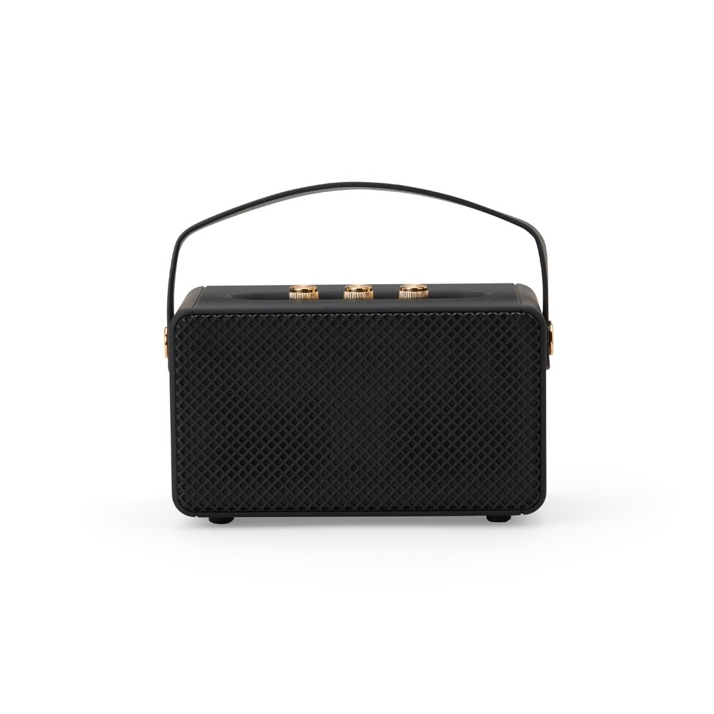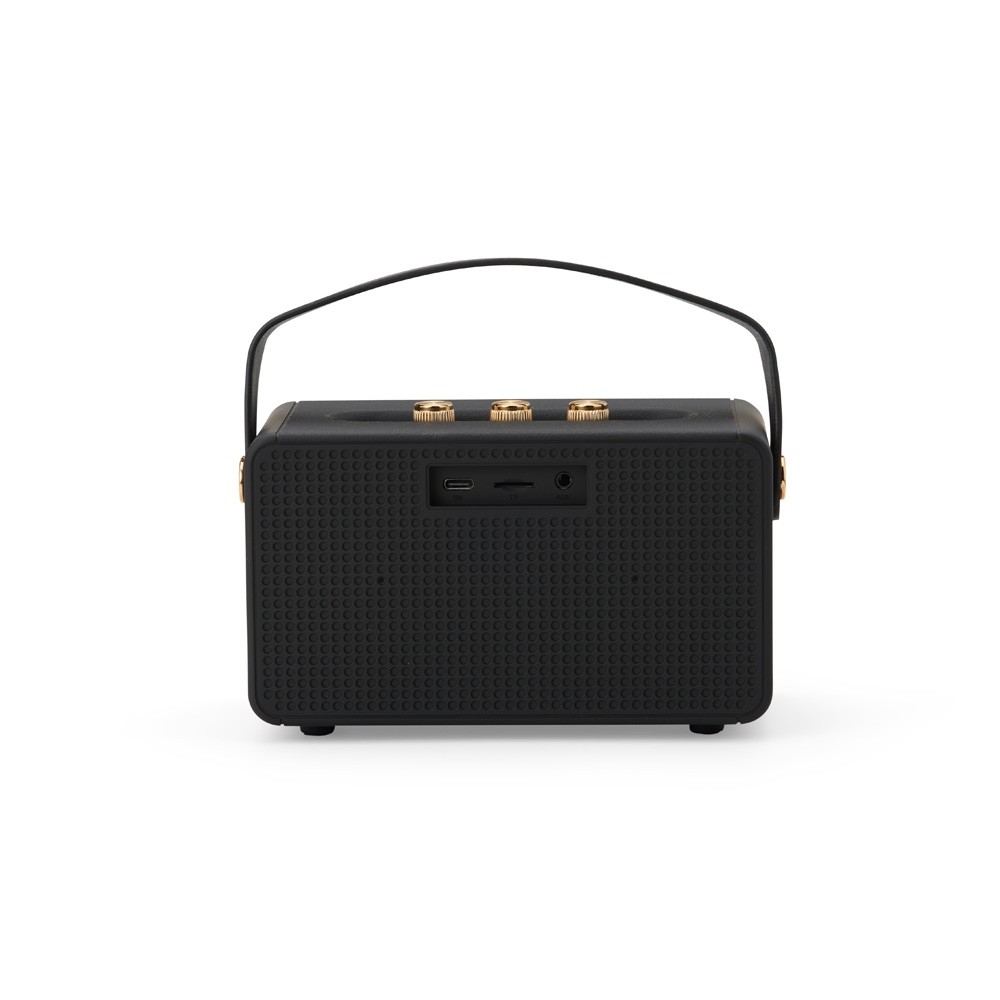 Caixa de som multimídia com design inspirado em amplificadores de guitarra. Possui construção em plástico ABS e metal, classificação IPX4 resistente a respingos d’água, painel superior de botões para controle, alça em couro sintético para transporte e pés com revestimento emborrachado. Oferece conectividade Bluetooth 5.1 e entrada para cabo auxiliar P2, além de cartão TF (MicroSD) e USB-A, permitindo a reprodução de arquivos MP3. Acompanha cabo USB-C para carregamento.