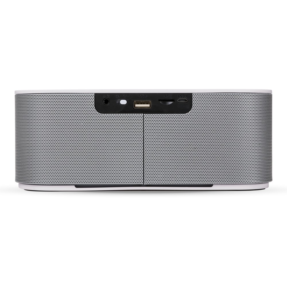 Caixa de som multimídia com estrutura feita em plástico, revestimento metálico e detalhes em material antideslizante na base. Possui conexão Bluetooth e rádio FM, além de painel de botões para controlar a reprodução de músicas a partir de aparelhos pareados, pen drives ou cartões microSD, por meio das entradas USB-A e TF. Conta ainda com entrada auxiliar P2 e acompanha cabo micro-USB para carregamento do aparelho.