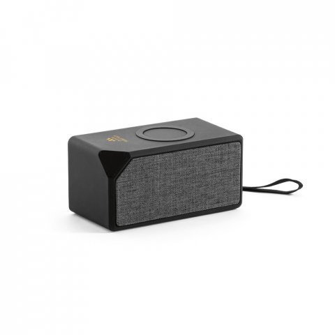 Caixa de som portátil em ABS com acabamento em borracha e tecido na parte frontal. De design sofisticado, esta caixa de som tem uma bateria de 300 mAh e autonomia aproximada de 2 horas, com transmissão sem fios BT v5.0 e potência de 3W. Adicionalmente tem também a funcionalidade de carregador por indução (wireless), com uma potência de 5 W. Compatível com dispositivos móveis com tecnologia de carregamento sem fios. Incluso cabo de carregamento USB. Fornecida em caixa presente. 108 x 56 x 54 mm