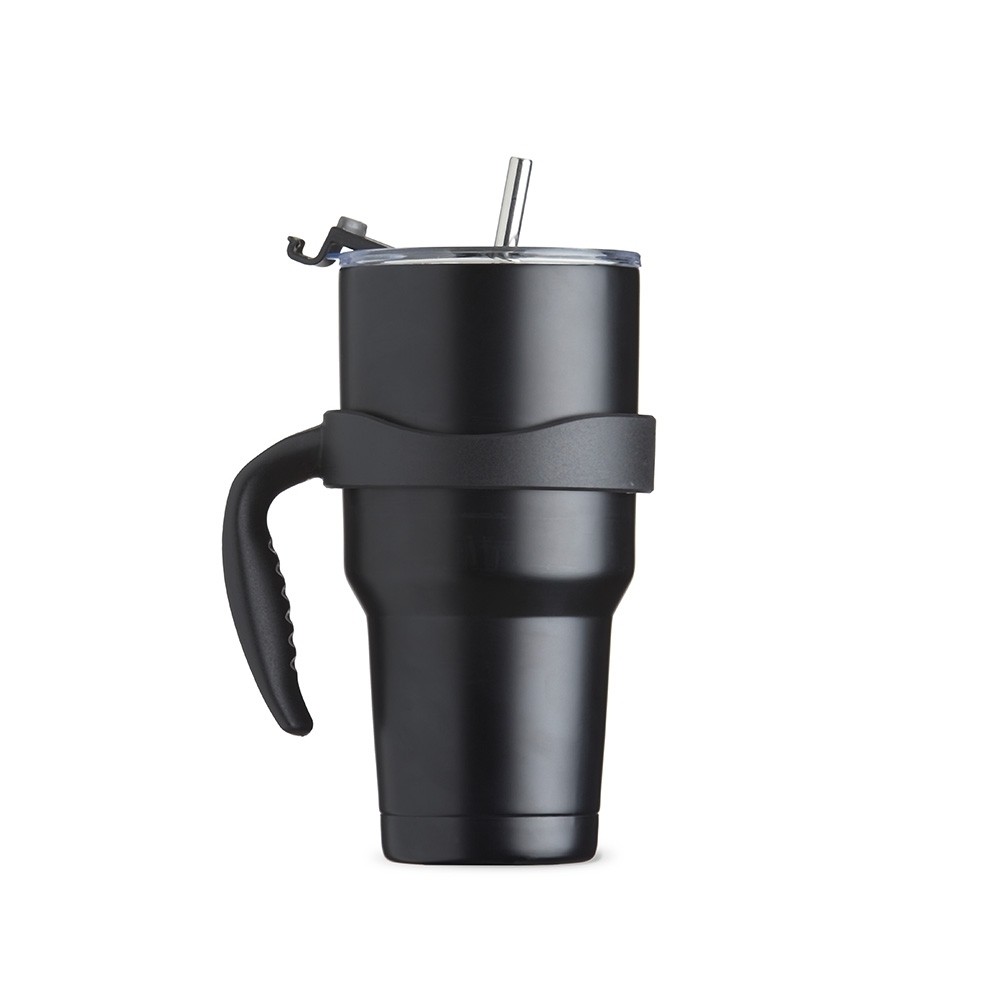 Caneca térmica de inox com capacidade para 800 ml, contém duas tampas, sendo uma acrílica com bocal, trava de segurança, e uma pequena tampa acoplada emborrachada para dissipação da temperatura, e a segunda tampa acrílica, contém compartimento que ao deslizar acessará ao bocal. Acompanha canudo de inox e escovinha de limpeza.