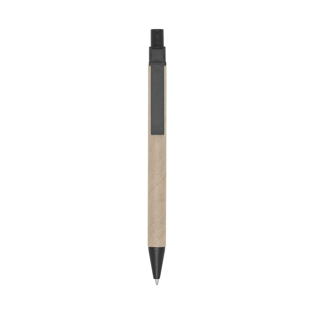 Caneta de papelão com detalhes plásticos, carga esferográfica azul 1.0 mm e acionamento por clique.