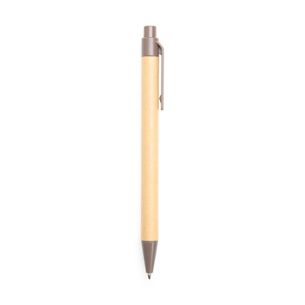 Caneta com corpo em papelão, ponteira e clip em plástico ABS, com acionamento por clique e carga esferográfica azul de 1,0mm.