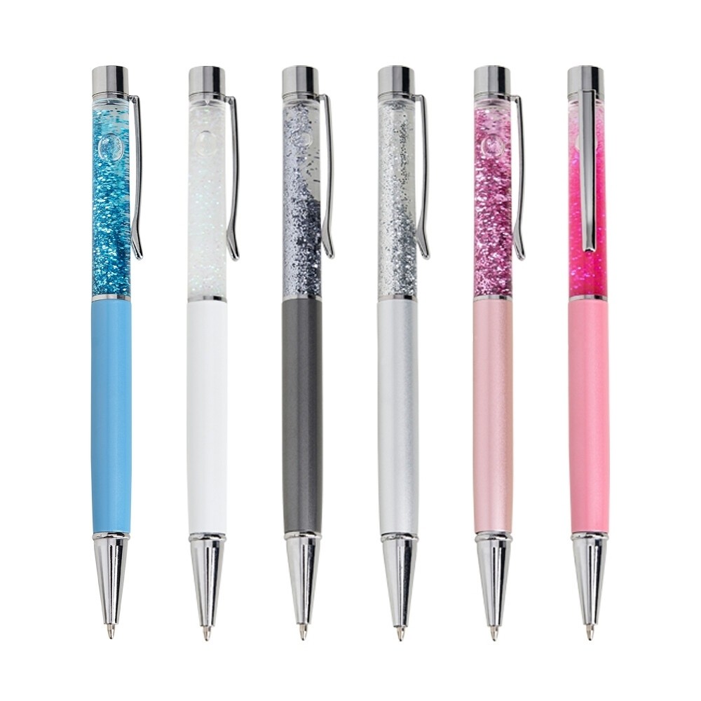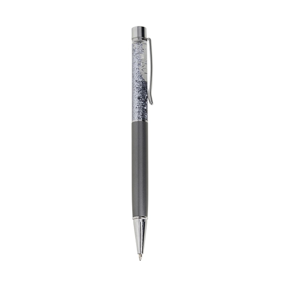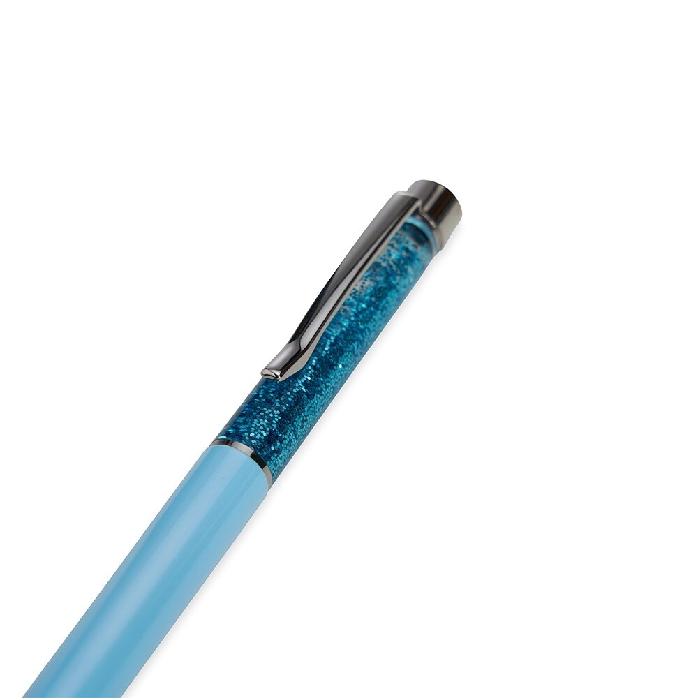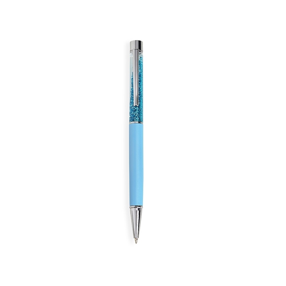 Caneta metálica com glitter, acionamento por rotação e carga esferográfica 1.0mm azul.