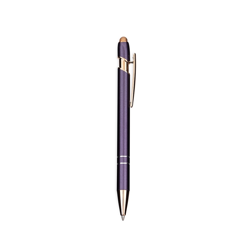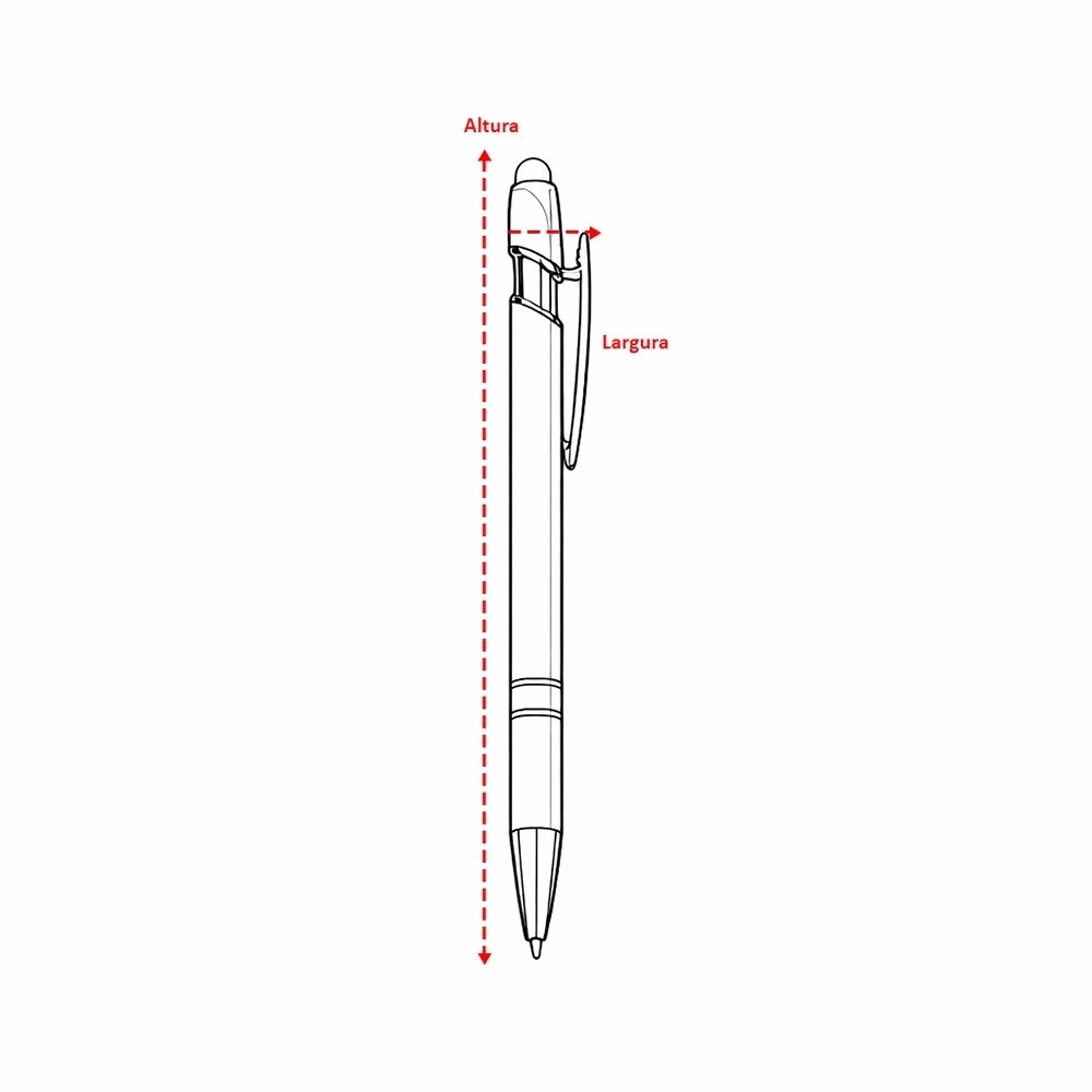 Caneta metálica com detalhe emborrachado no topo, ideal para interação com dispositivos de telas sensíveis ao toque. Possui acionamento por clique e carga esferográfica azul de 1,0mm.
