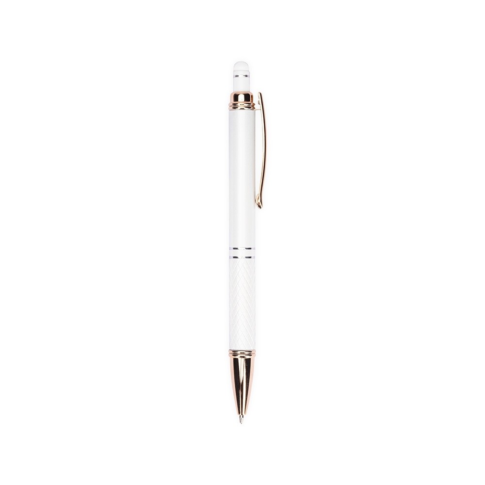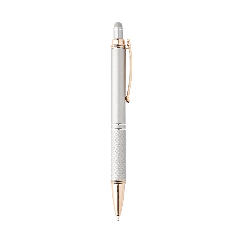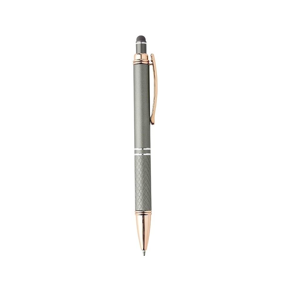 Caneta metálica touchscreen com parte inferior texturizada, acionamento por clique e carga esferográfica azul 1.0mm.