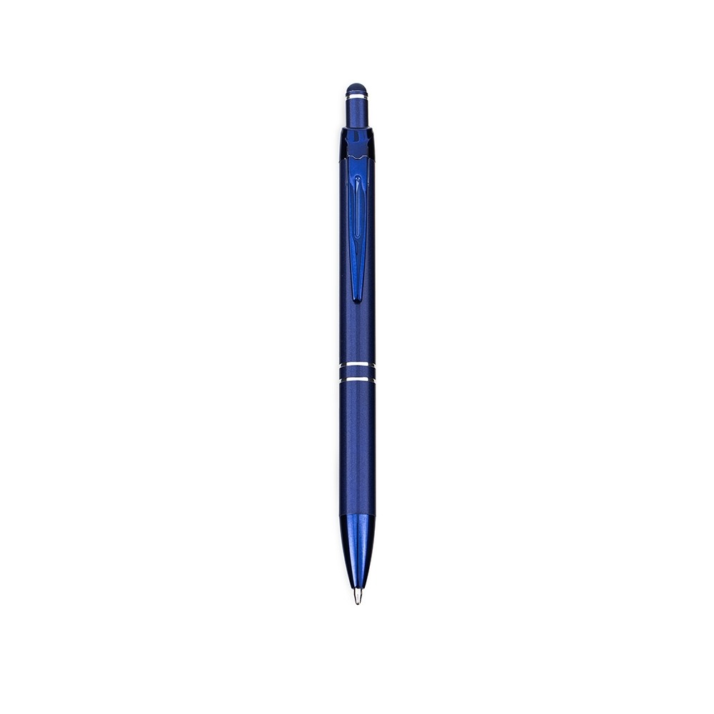 Caneta em metal com clip e ponta em plástico, além de detalhe emborrachado no topo para interação com dispositivos de telas sensíveis ao toque. Conta com acionamento por clique e carga esferográfica azul de 1,0mm.