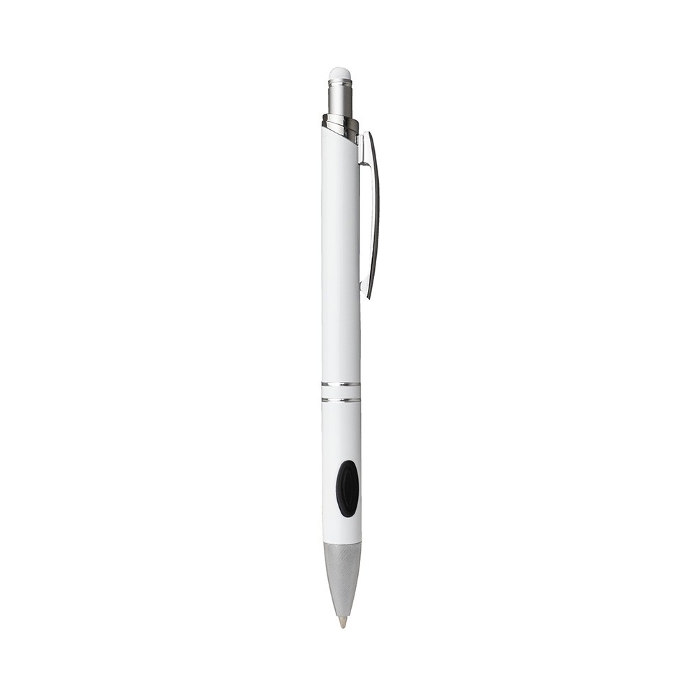 Caneta metálica com touchscreen, com detalhe emborrachado na parte inferior, carga esferográfica azul de 1.0 mm e acionamento por clique.