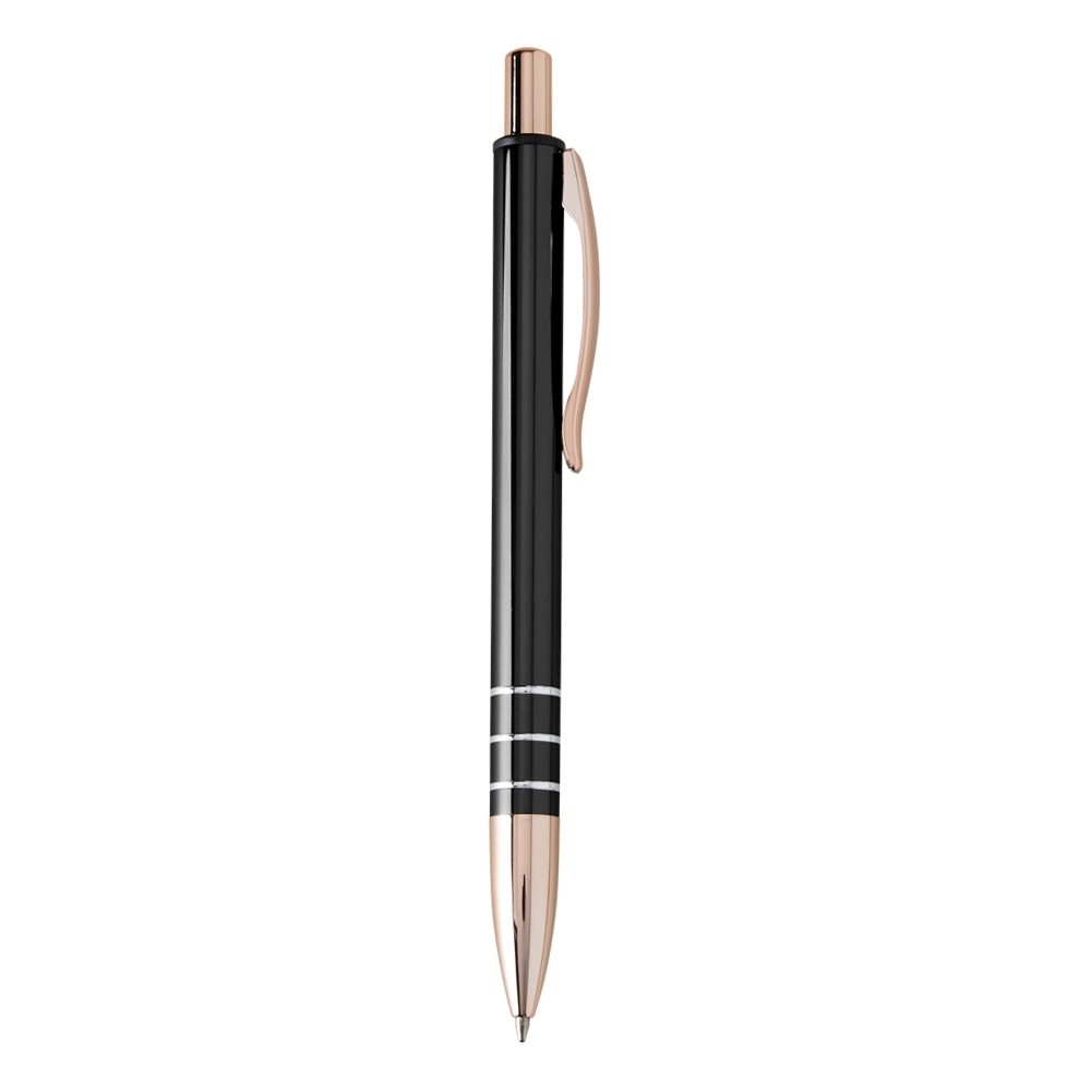 Caneta metálica com carga esferográfica azul 1.0mm e acionamento por clique.