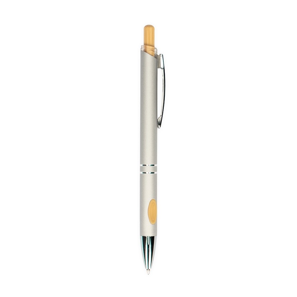 Caneta metálica com detalhes emborrachados no corpo, acionamento por clique com parte superior em bambu, carga esferográfica azul de 1.0mm, o que proporciona uma pegada leve e uma escrita precisa. Especificações: - Largura  1,5 cm - Comprimento  14,2 cm - Medidas aproximadas para gravação(CxL)  0,8 cm x 6 cm - Peso aproximado(g)  17